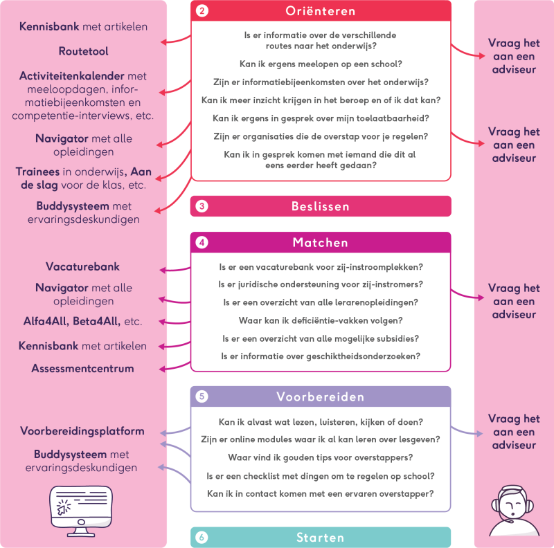 Het overgrote deel van de potentiële overstappers kent de organisatorische structuur in het onderwijs niet. Velen hebben weinig beeld bij het werken in de verschillende sectoren, of van de bevoegdhedenstructuur die daar overheen ligt. In plaats daarvan vragen zich eerst hele basale dingen af (”past het onderwijs bij mij?”), en vervolgens ook hele specifieke (”op welke school kan ik een dagje meelopen?”). Uiteindelijk wil een overstapper gewoon een fijne plek op een fijne school vinden, waar ze goed georiënteerd en met vertrouwen aan de slag kunnen.